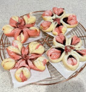 さて、3月のメニュー案内です。毎年、3月は春を待つ思いをパンに託して、春色パンのメニューにしています。今年は「桜花びらあんパン」に決めました。桜色生地と白色生地のコントラスなパンに仕上げます。もう一品は「ポテトとフライドオニオンのフォカッチャ」です。食事パンとして重宝しますよ。